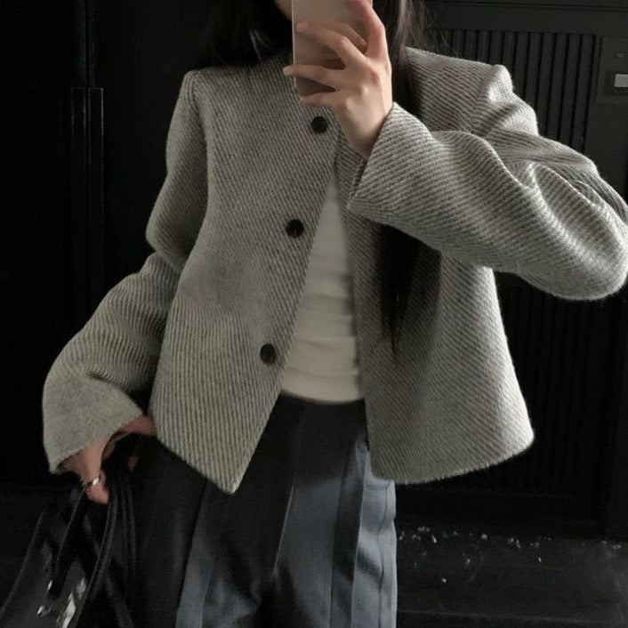 The subtle woven texture adds depth without overpowering your look, while the cropped length pairs beautifully with high-waisted trousers or skirts. A versatile layering piece for transitional seasons.