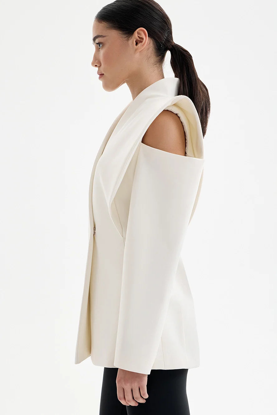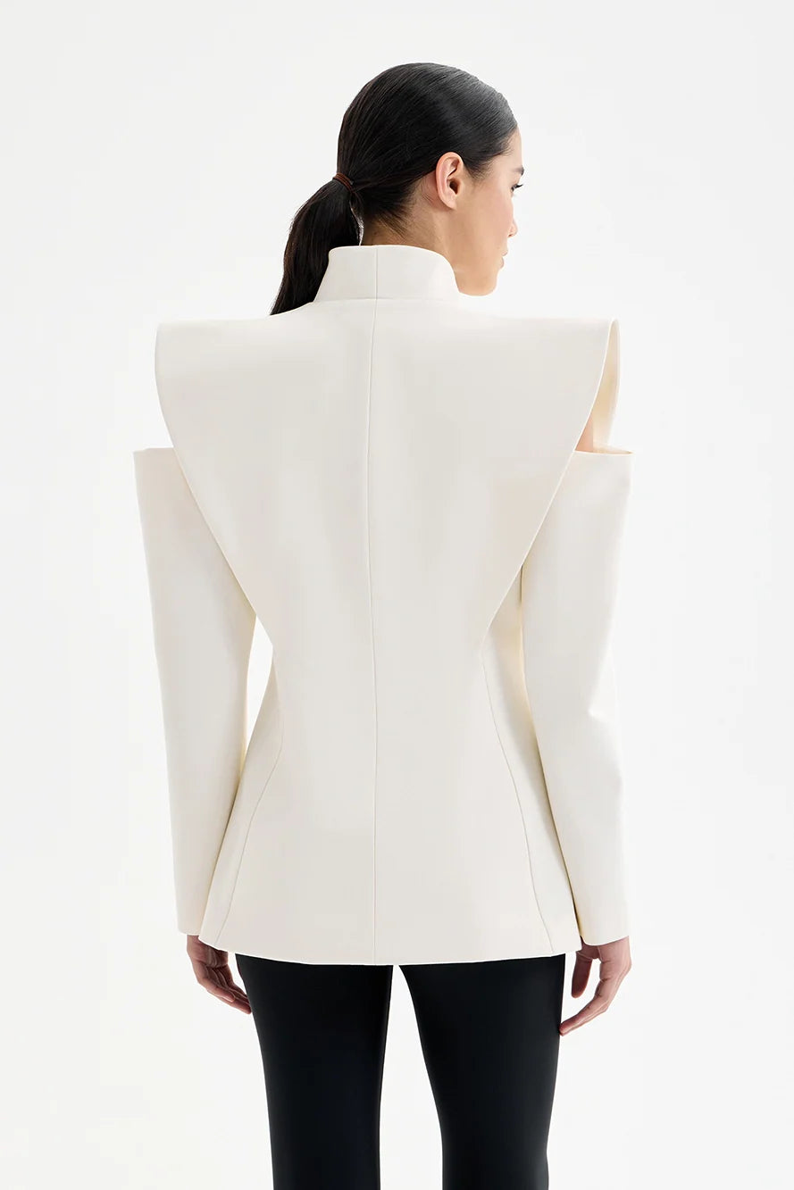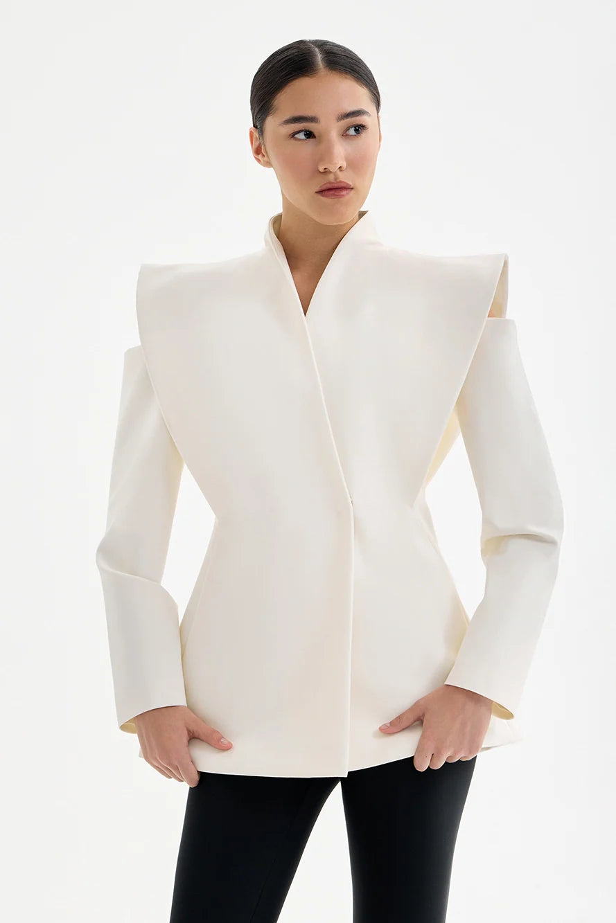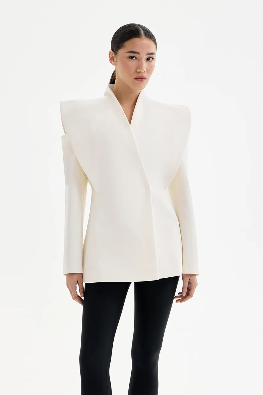 - Architectural design – sculptural, oversized shoulders for immediate impact.